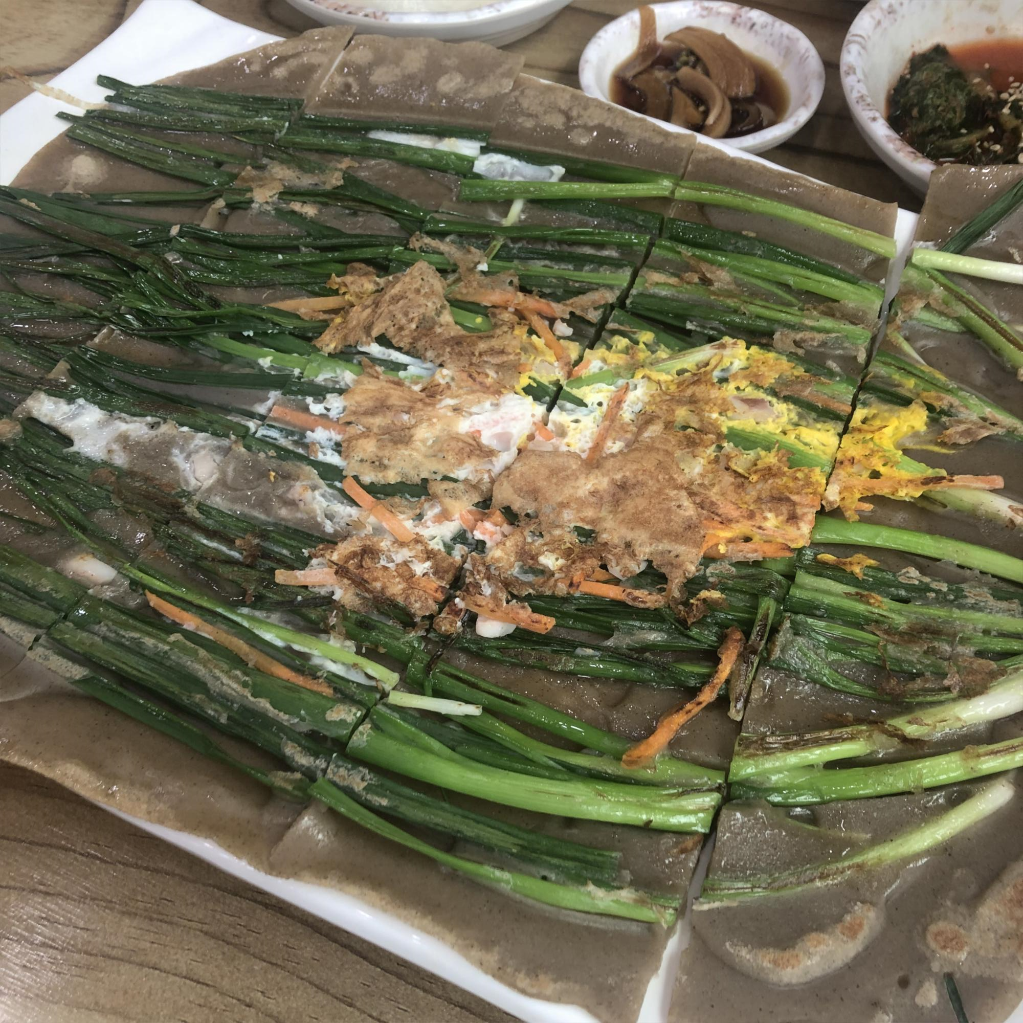 메밀 파전은 메밀 전위에 쪽파, 오징어, 계란이 올려져 있는 전인데 메밀이 기본 베이스로 되어있어 정말 쫄깃하고 고소한 맛이 정말 맛있었습니다. 저는 수육, 만두보다 이 파전을 항상 시켜 먹는데 가격도 싸고 맛있어 항상 만족하면서