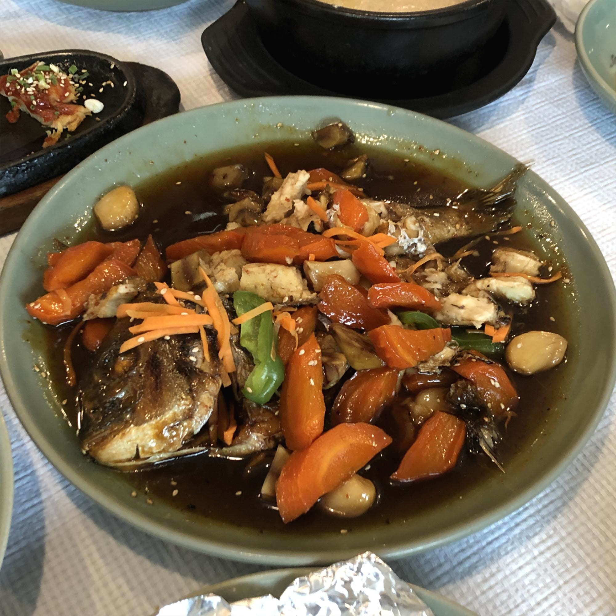 여러 가지 메인 메뉴 들과 밑반찬을 다 먹으면 마지막에 누룽지와 밥을 선택하라고 하시는데 밥으로 주시라고 하면 밥과 국을 주시고 누룽지를 주라고 하면 누룽지를 주십니다. 저는 밥 대신 누룽지를 선택했는데요 누룽지와 함께 낙지볶음, 조기가 나왔는데 누룽지와 같이 먹으면서 누룽지의 심심한 맛을 잡아주는 느낌이어서 좋았습니다.