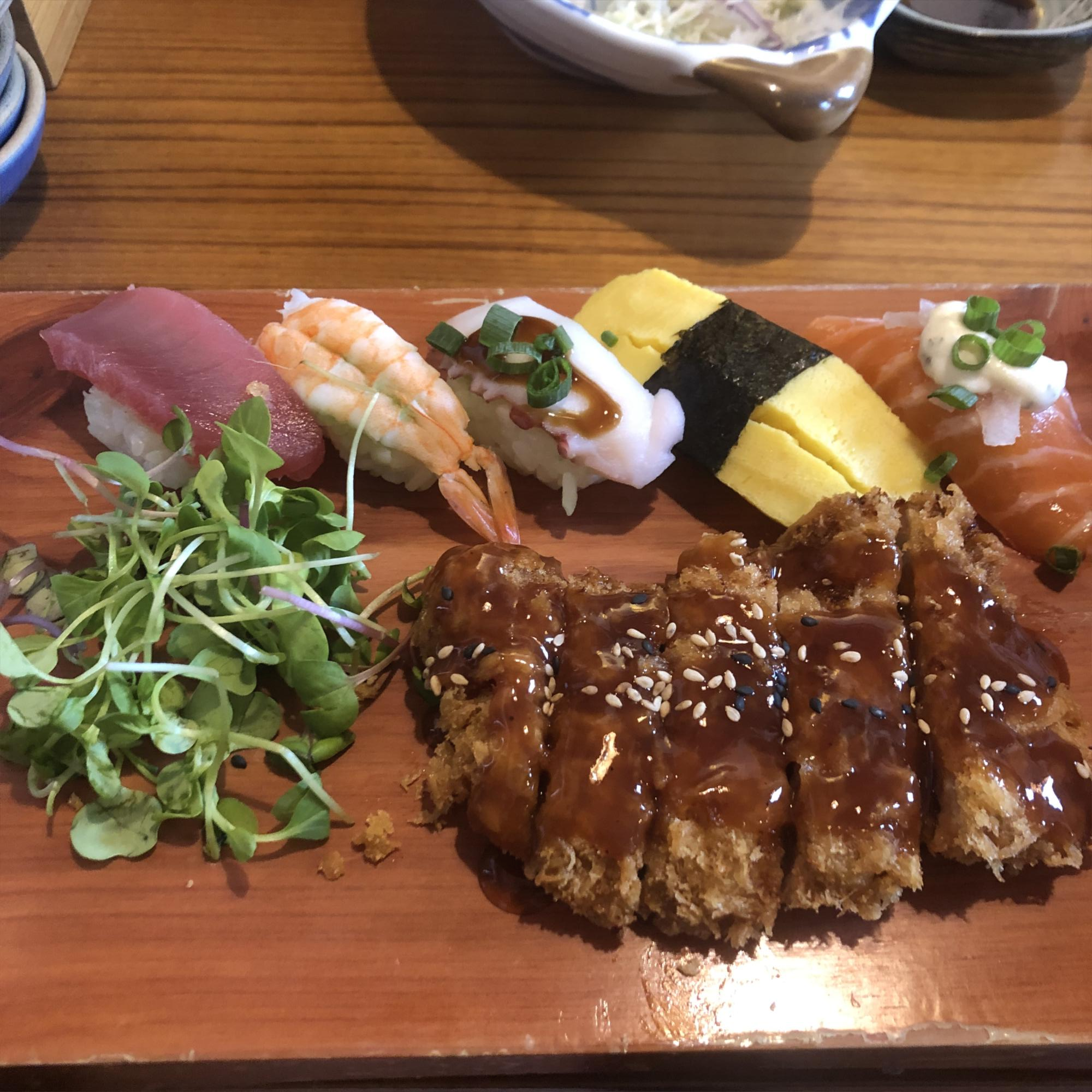 저희는 점심에 화요스시집을 갔는데 손님이 만석이어서 한 5분쯤 대기를 하고 들어갔습니다. 자리에 앉고 메뉴판을 본후에 점심특선인 초밥정식을 주문했습니다. 초밥정식은 점심특선이고 가격은 8300원입니다. 초밥 5pcs,미니돈까스,미니우동이 한 세트로 나옵니다. 오전 11시 30분부터 1시 반까지만 주문할 수 있고 아쉽게도 토, 공휴일은 주문을 제외하고 포장은 안된다고 합니다. 주문을 하면 샐러드와 단무지, 초생강, 초마늘을 세팅해주시고 조금 있으면 깨끗한 기름에 갓 튀긴 것 같은 따뜻하고 두툼한 감자튀김을 주십니다. 저는 이게 여기의 또 하나의 별미라고 생각하는데요. 감자튀김이 정말 두툼했고 사장님이 깨끗한 튀김으로 튀기셨는지 튀김 색깔이 정말 깨끗해 보였습니다. 초밥정식에 초밥은 5pcs가 나오는데 초밥 종류는 위에 사진 왼쪽부터 말씀드리자면 참치, 새우, 문어, 계란초밥, 연어 입니다. 일단 저는 초밥 맛은 전체적으로 좋았고 신선했습니다, 8500원 가격에 이 정도 퀄리티면 가격대비 괜찮다고 생각했습니다. 미니 돈까스의 튀김도 정말 바삭바삭해서 좋았고 고기의 두께도 적당했습니다. 소스가 뿌려져 있었는데도 소스맛이 달달하고 튀김옷이 눅눅하지 않고 바삭해서 식감이 좋았습니다.